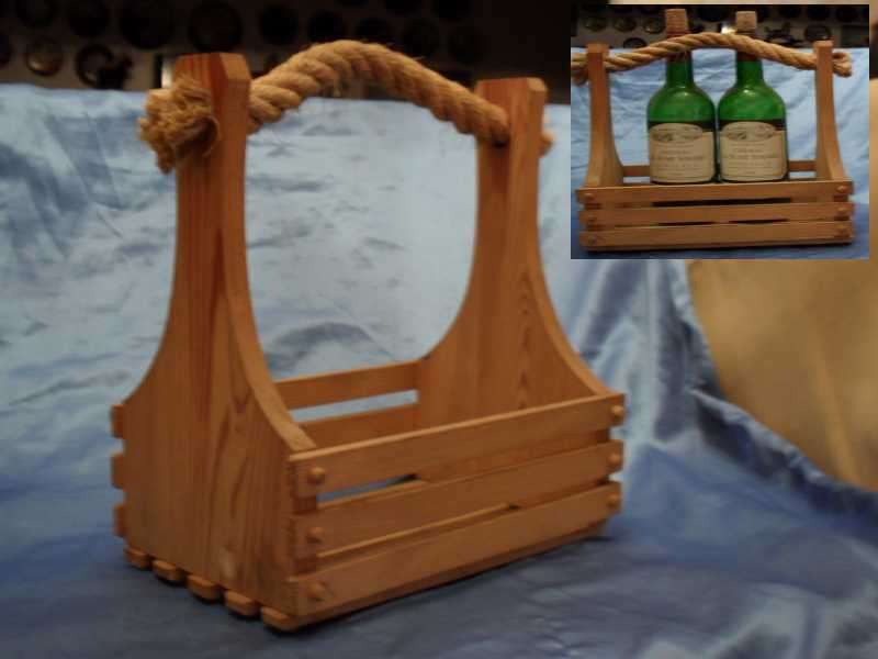 Artikelnummer: 0352 Flaschenstaender Flaschentraeger Flaschenhalter aus Holz Griff dickes gedrehtes 3 cm starkes Seil hoch 30 cm breit 26 cm expertic DDR Artikelnummer:0352