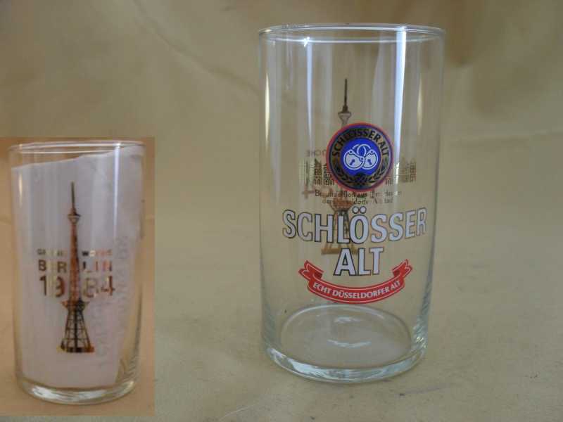 Altes Bierglas SCHLÖSSER ALT Beschriftung: Brautradition aus dem Herzen der Düsseldorfer Altstadt hinten auf dem Glas steht GRÜNE WOCHE BERLIN 1984 Fassungevermögen 0,2l hoch 11 cm gemarket mit W