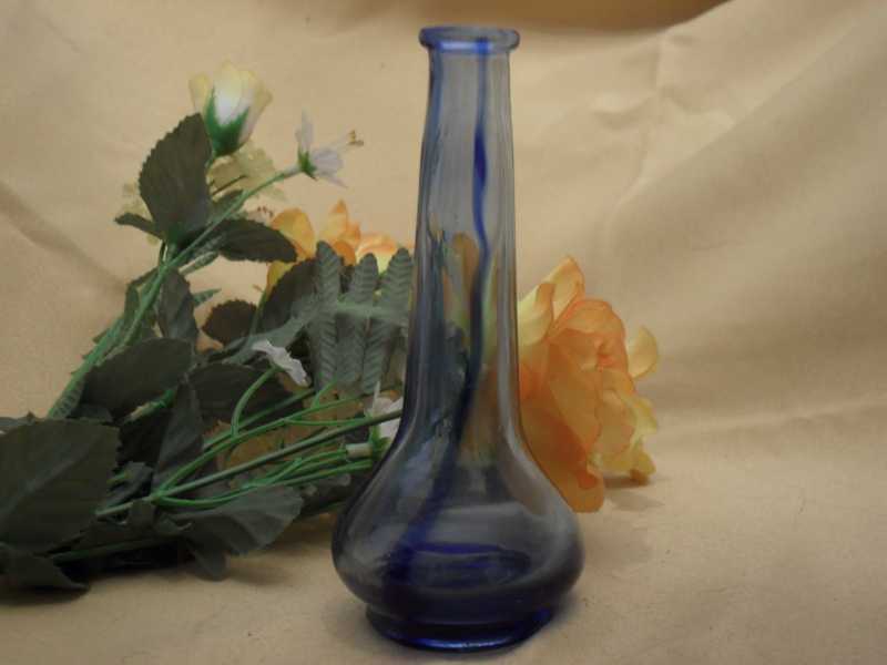 Artikelnummer: 0900 Blumenvase Glasvase mittelblau mit dunkelblauer Zeichnung hoch 13,5 cm Vasenöffnung ca. 2,2 cm Durchmesser unten ca. 6 cm Artikelnummer:0900