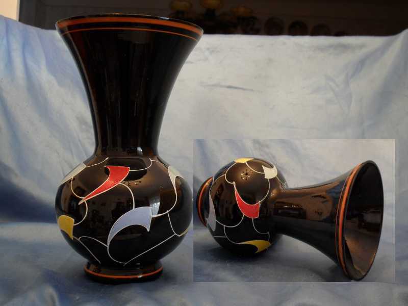 Artikelnummer: 0388 Alte Blumenvase Glasvase schwarz abstraktes Muster handbemalt hoch 20,5 cm Vasenoeffnung 12 cm Bodenflaeche 6,5 cm Artikelnummer:0388