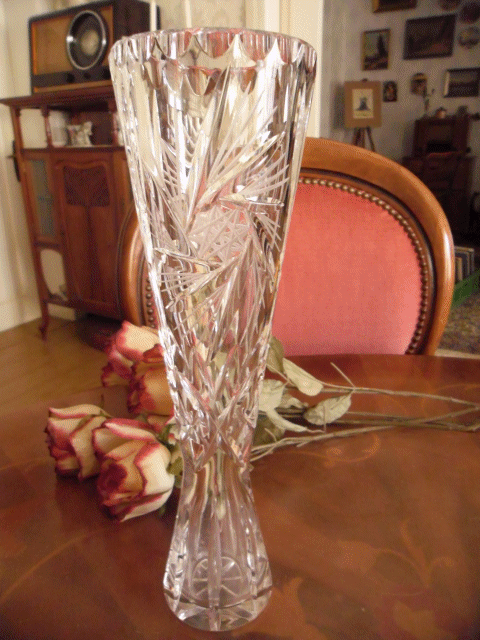 Blumenvase Kristallvase mit Schleuderstern und Rautenmotiv handgeschliffen Art Deco