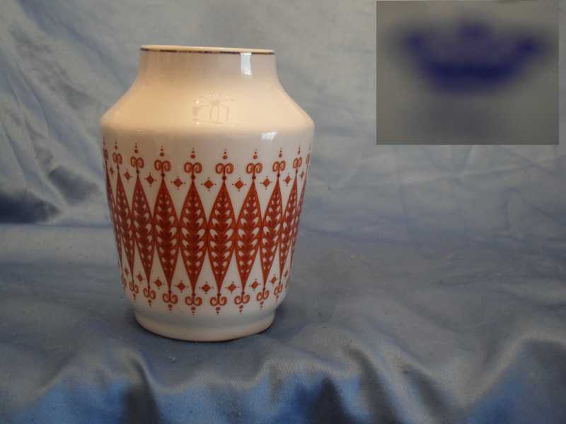 Artikelnummer: 0393 Blumenvase Porzellanvase weissfarben hellbraunes Design Goldrand hoch 13,5 cm Vasenoeffnung 6 cm Bodenflaeche 6,8 cm Wagner u. Apel Thueringen 1877 GDR Artikelnummer:0393