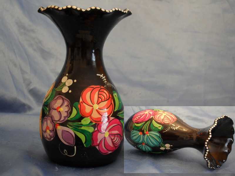 Artikelnummer: 0399 Blumenvase Glasvase schwarz Blumenmotiv gewölbter Rand weisse Punkte handbemalt hoch 15 cm Vasenoeffnung 9 cm Bodenflaeche 7 cm Artikelnummer:0399