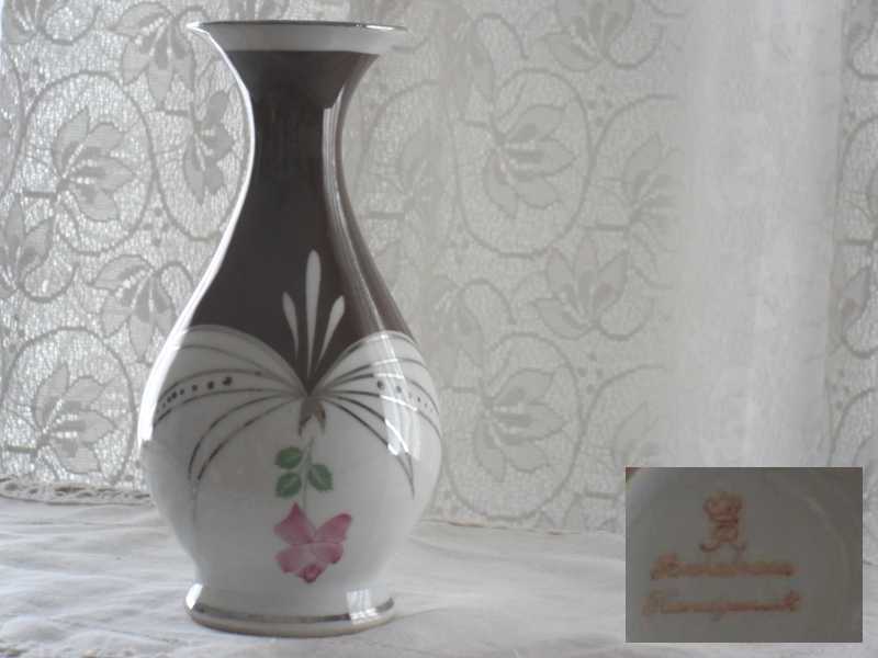 Artikelnummer: 0956 Alte Blumenvase Porzellanvase weiss braun silberfarben Blumenmotiv handbemalt hoch 14,6 cm Durchmesser Vasenoeffnung 5 cm Spechtsbrunn Artikelnummer:0956