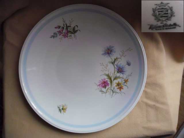 Artikelnummer: 1081 Grosser Kuchenteller Zierteller Tortenteller aus Porzellan Blumenmotiv hellblauer Rand Durchmesser 29 cm Weimar Porzellan Artikelnummer:1081