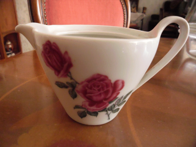 Artikelnummer:1169 Milchkaennchen Sahnekaennchen Porzellan mit Rosenmotiv hoch 7 cm Durchmesser mit Henkel und Tuelle 11 cm von Baramer Waldsassen Nr.705 Artikelnummer:1169
