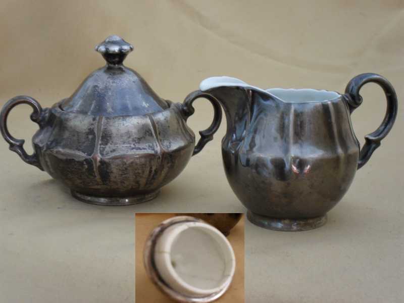 Artikelnummer: 0791 Alte Zuckerdose Milchkaennchen Sahnekaennchen Porzellan Silberauflange Durchmesser Zuckerdose 13 cm hoch 9,5 cm Durchmesser Milchkaennchen 11 cm hoch 8 cm WMF Artikelnummer:0791