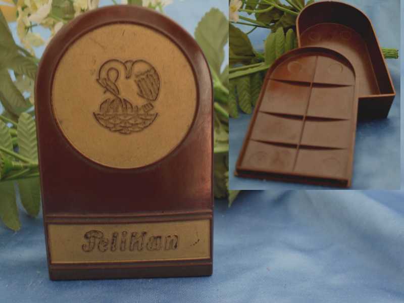 Artikelnummer: 0636 Alte Dose Schachtel Bakelit laengliche Form goldenes Dekor mit Pelikan lang cm hoch 2,6 cm breit 6 cm von Pelikan Guenther Artikelnummer:0636
