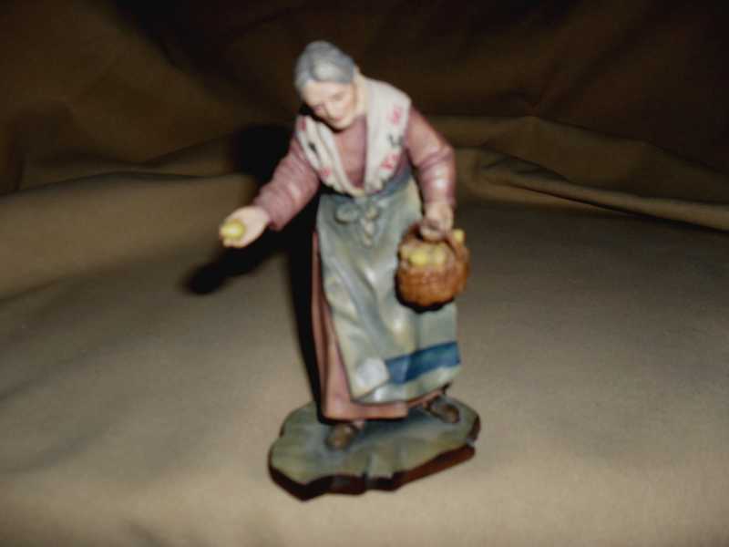 Artikelnummer: 0035 Holzfigur alte Frau mit Fruechtekorb handbemalt naturgetreu gearbeitet Handarbeit hoch 12 cm Massstab 1:15 Wood Carvings Trademark Großbritannien Artikelnummer:0035