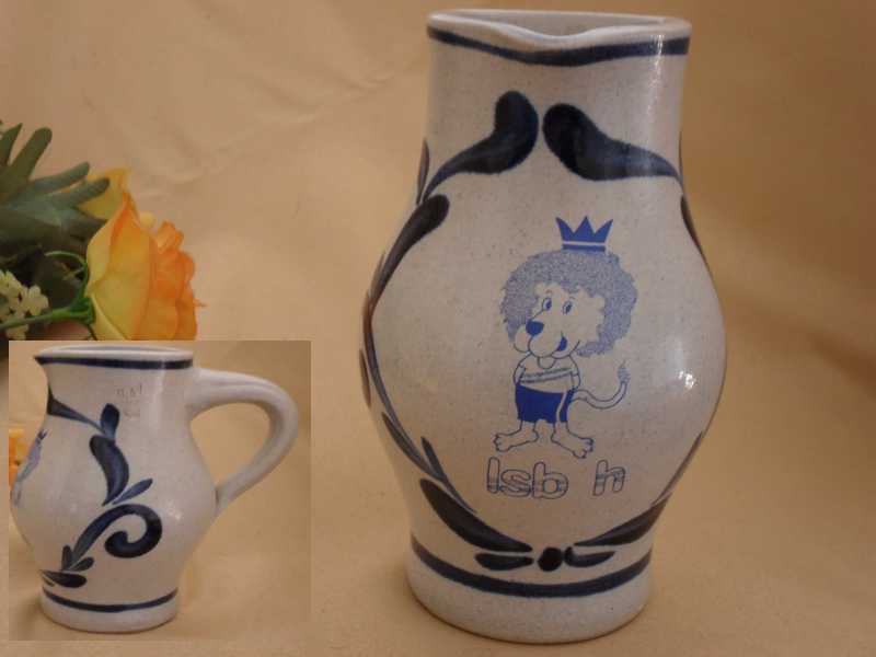 Alter Weinkrug Steinkrug lsb h Landessportbund Hessen mit Maskottchen Löwe Fassungsvermögen 0,5 Liter hoch ca. 16,5 cm Durchmesser mit Henkel gemessen ca. 13 cm gemarket mit 2 W übereinander.