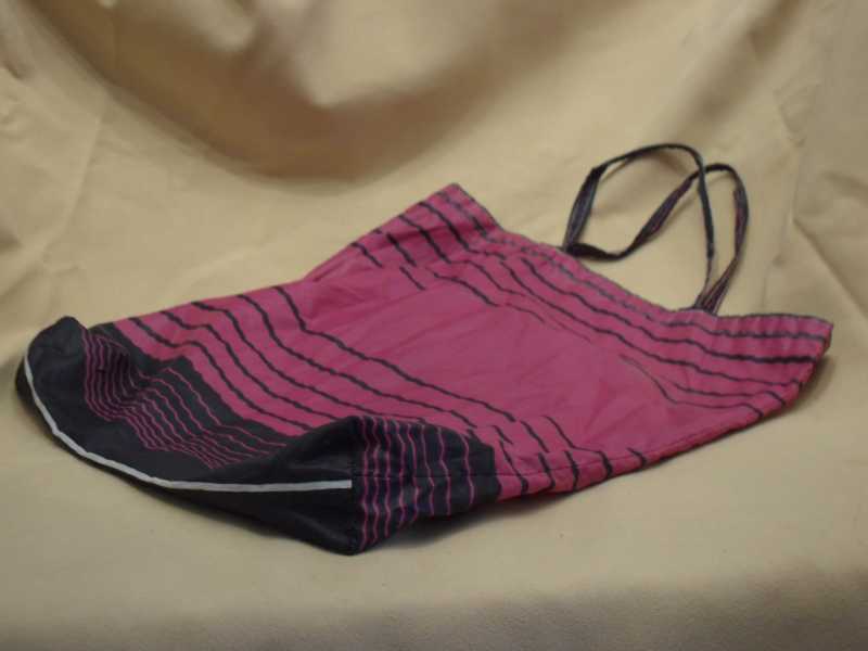 Artikelnummer: 0197 Einkaufsbeutel Einkaufstasche Streifenmuster in schwarz und lilafarben Original DDR lang 39 cm ohne Henkel breit cm 35,5 Material Nylon Artikelnummer:0197