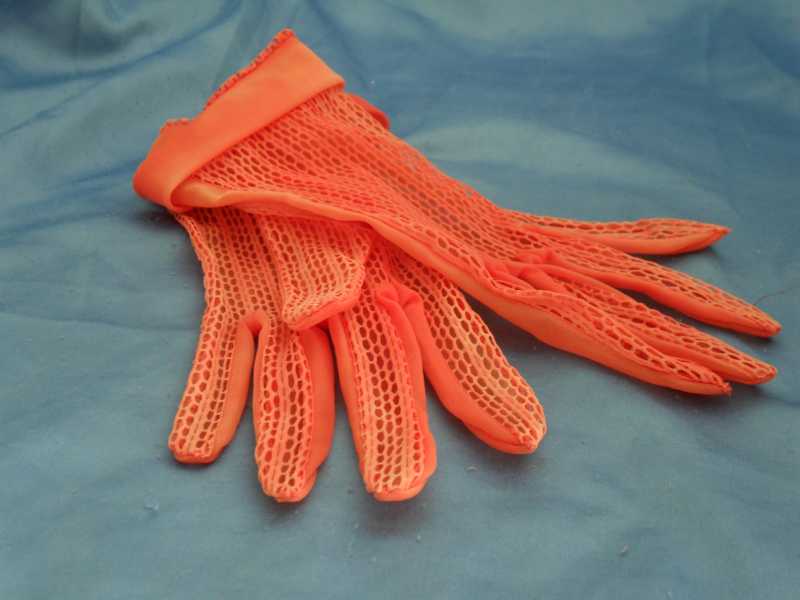 Artikelnummer: 0164 Hellrote Perlonhandschuhe Damenhandschuhe durchbrochenes Muster Original 50er 60er Jahre Groesse S oder 6-7 Artikelnummer:0164