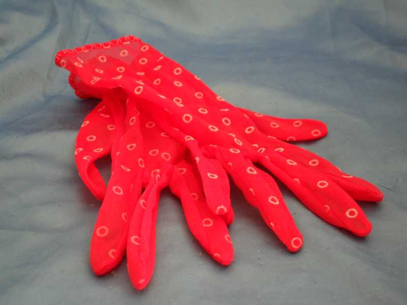 Artikelnummer: 0165 Rote Perlonhandschuhe Damenhandschuhe mit kleinen weissen Kreisen Original 50er 60er Jahre Groesse S oder 6-7 Artikelnummer:0165